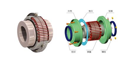 蛇形彈簧聯(lián)軸器其主要結(jié)構(gòu)是由兩個半聯(lián)軸節(jié),兩個半外罩,兩個密封圈及蛇形彈簧片組成。它是靠蛇簧嵌入兩半聯(lián)軸節(jié)的齒槽內(nèi)來傳遞扭矩,聯(lián)軸器以蛇形彈簧片嵌入兩個半聯(lián)軸節(jié)的齒槽內(nèi),來實現(xiàn)主動軸與從動軸的鏈接。運(yùn)轉(zhuǎn)時,是靠主動端齒面對蛇簧的軸向作用力帶動從動端,來傳遞扭矩,如此在很大程度上避免了共振現(xiàn)象發(fā)生,且簧片在傳遞扭矩時所產(chǎn)生的彈性變量,使機(jī)械系統(tǒng)能獲得較好的減振效果,其平均減振率達(dá)36%以上。